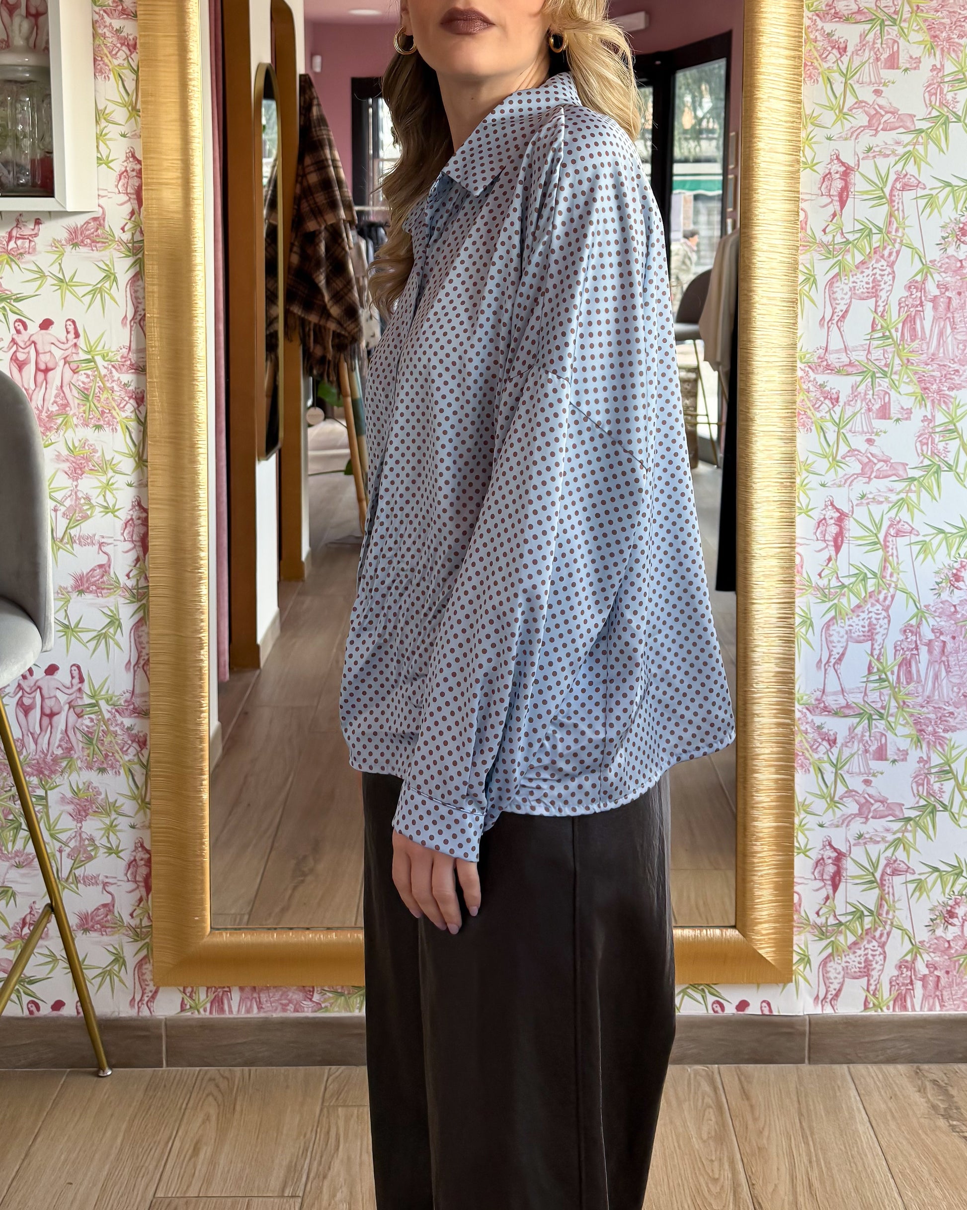 Camicia in tessuto raso, base celeste pois marroni, con manica scesa, quindi modello over, lunghezza regolare. Adatta anche a chi ha seno più grande