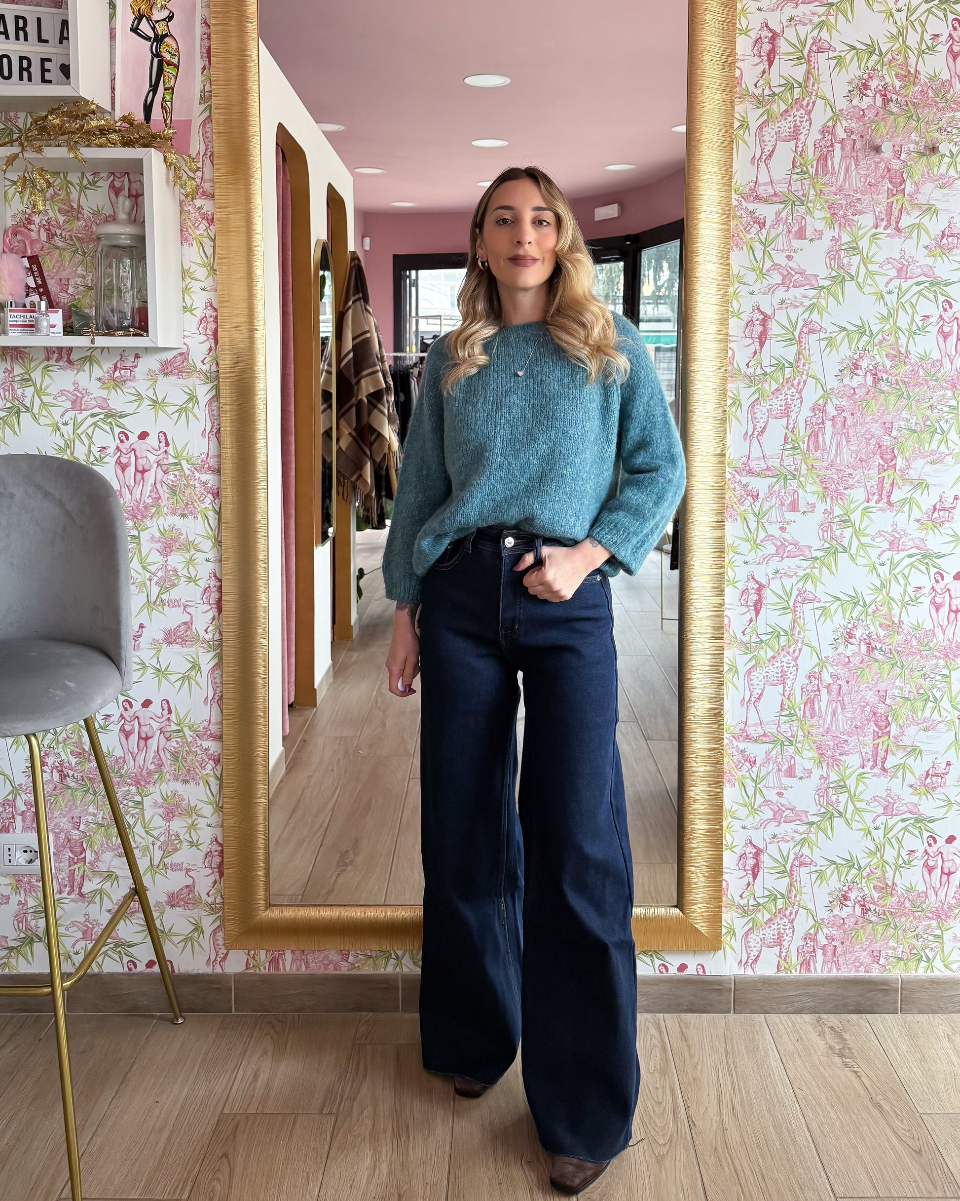 Jeans a vita alta, a palazzo, interno felpato, orlo a vivo, veste piccolo