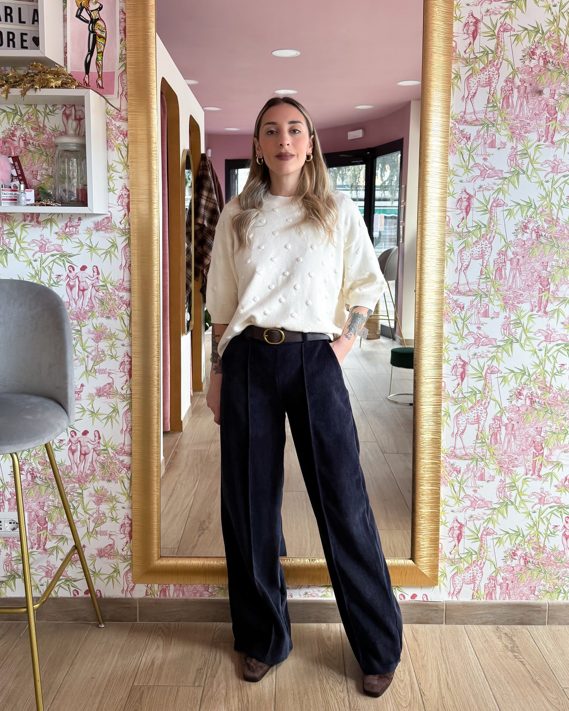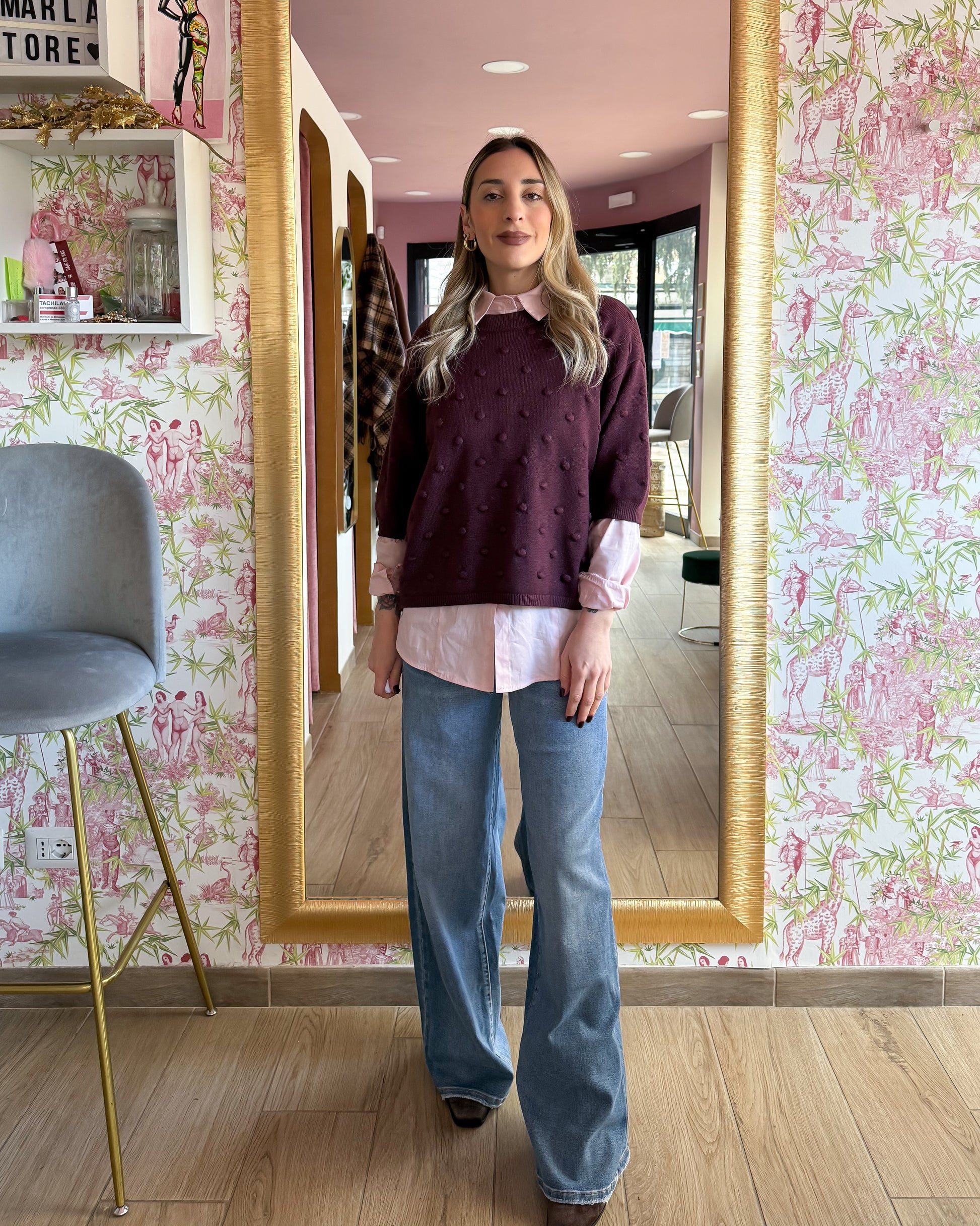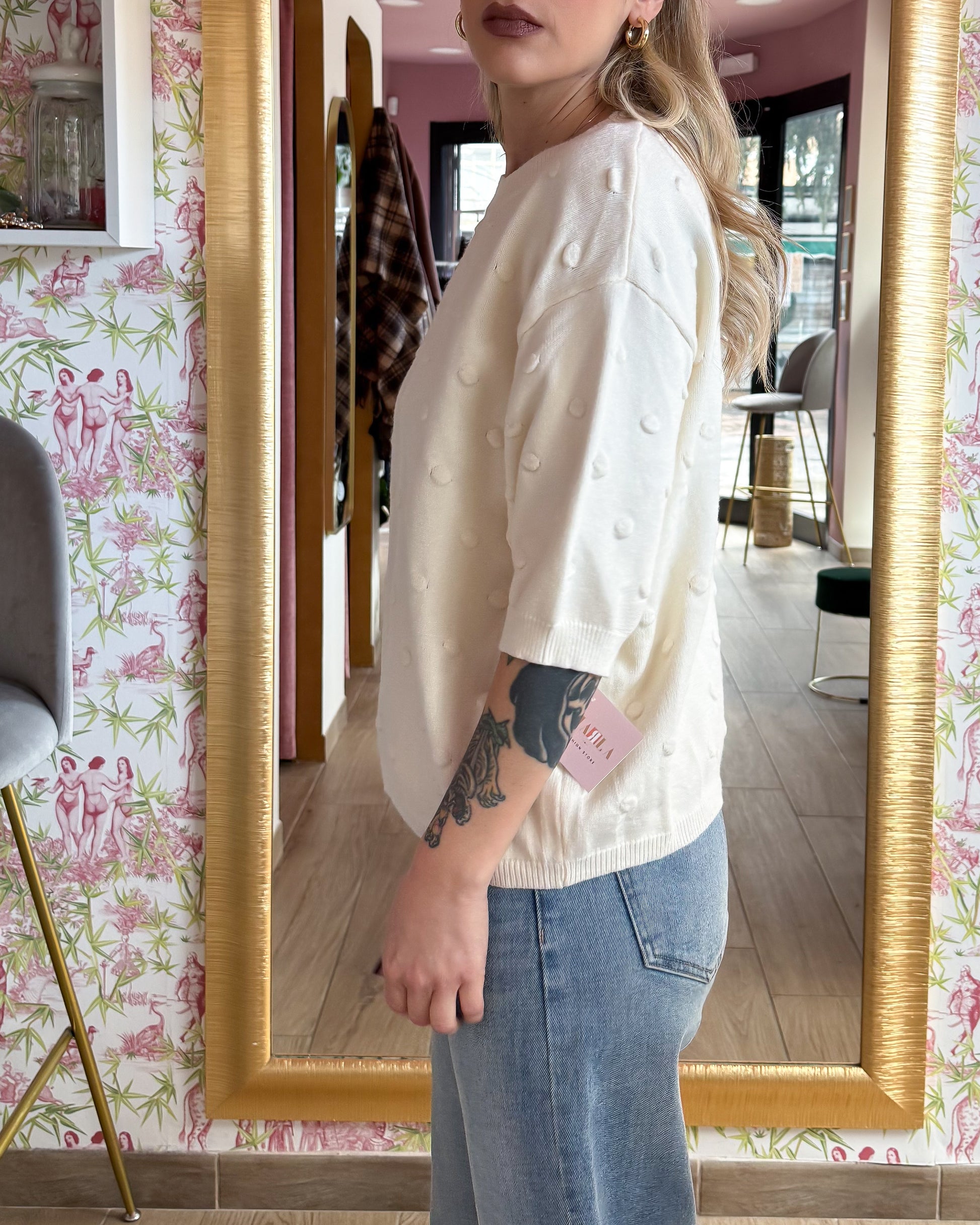 Maglia girocollo a manica corta fino al gomito, con pallini in rilievo. Taglia unica, veste comoda