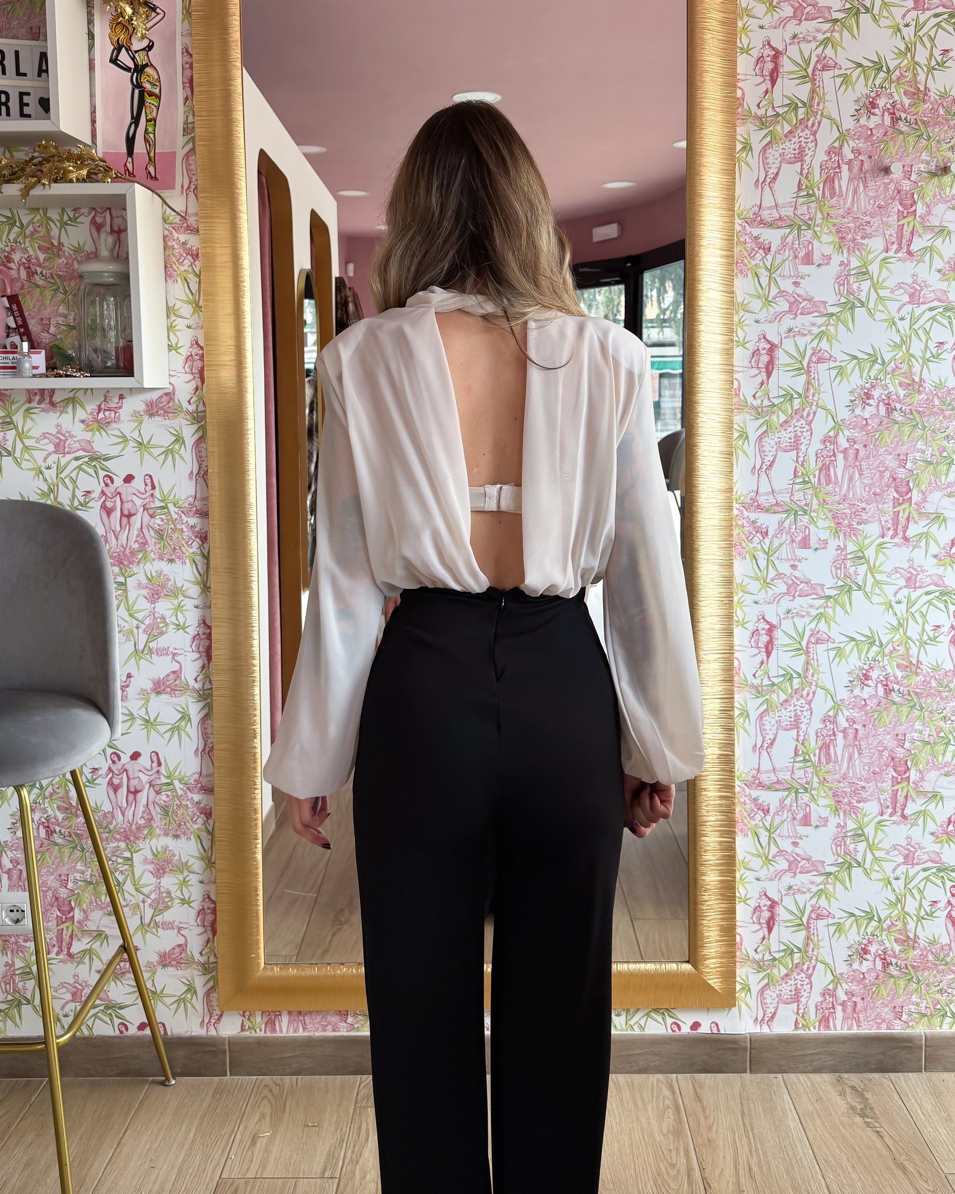 Tuta intera con spalline, chiusura dietro al collo con un fiocco, elastico sul polsino e sulla vita, zip posteriore. Nonostante il tessuto del pantalone sia elasticizzato, veste piccolina